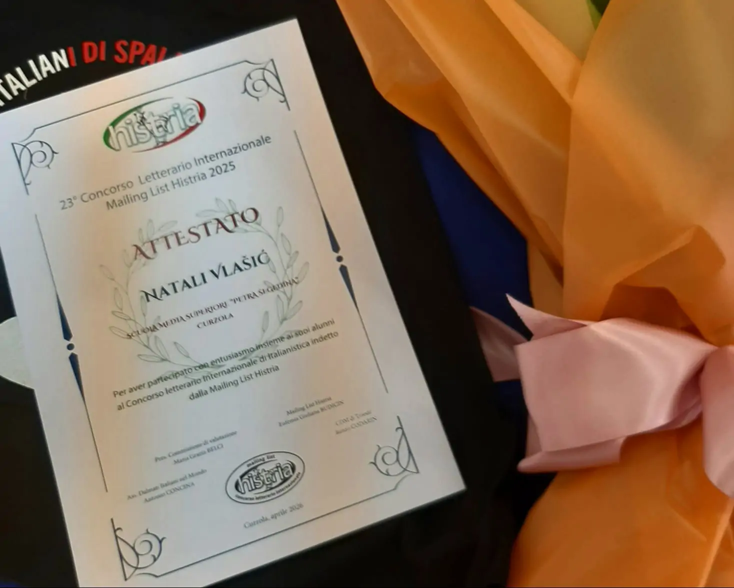 U organizaciji CI "Comunità di italiani Split' Udruga Talijana Split, krajem ožujka je u restoranu Sv. Antun Srednje škole Petra Šegedina na svečanoj dodjeli nagrada za 23. međunarodno književno natjecanje iz talijanistike uručeno je i međunarodno Priznanje za entuzijazam u književnom natjecanju, mentorici profesorici Natali Vlašić iz Vele Luke. Sudjelovale su osnovne i srednje škole iz Slovenije, Hrvatske i Crne Gore.