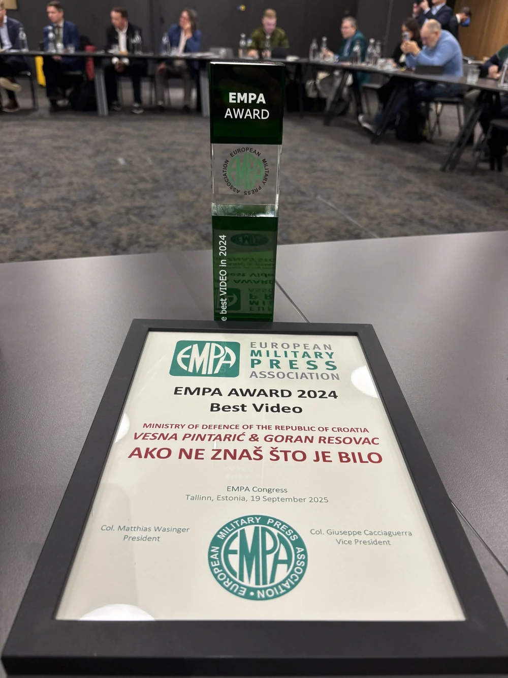 Nagradu je redateljici Vesni Pintarić uručio predsjednik EMPA-e, brigadir Matthias Wasinger, glavni urednik austrijskog časopisa Defence Horizon.