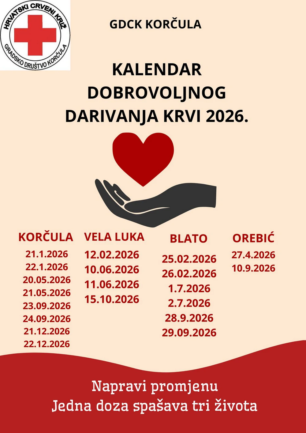 Gradsko društvo Crvenog križa Korčula objavilo je kalendar dobrovoljnog darivanja krvi za 2026. godinu, pozivajući sve građanke i građane da se i ove godine uključe u jednu od najhumanijih akcija, darivanje krvi koje spašava živote.