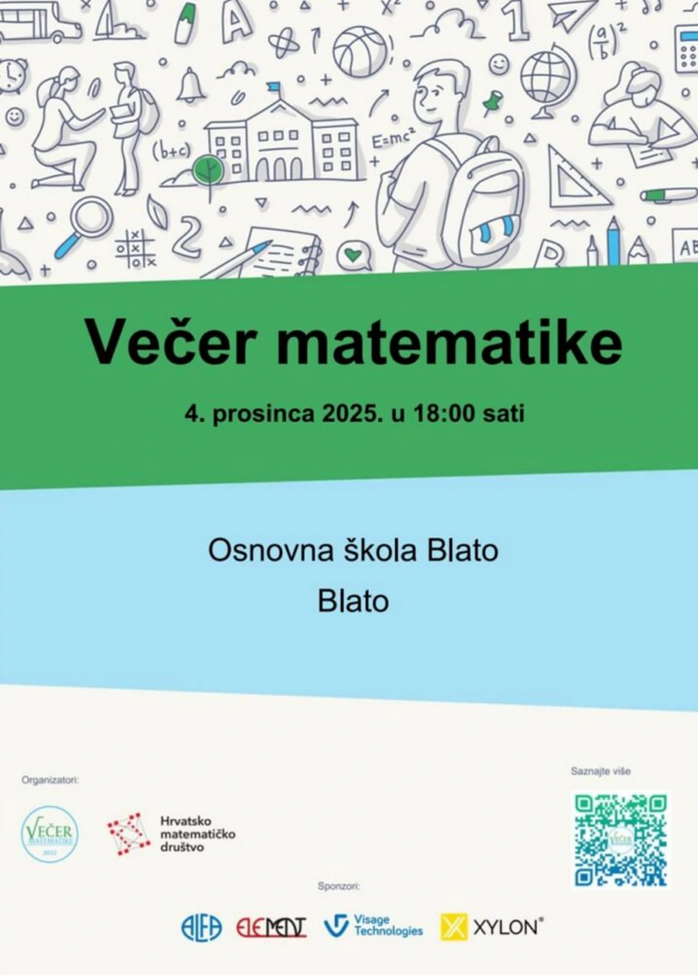 I ove će se godine, u četvrtak 4. prosinca, Osnovna škola Blato ponovno pridružiti velikoj nacionalnoj manifestaciji Večer matematike, koja će se istodobno održavati u školama diljem Hrvatske. S početkom u 18 sati, škola će se pretvoriti u razigrani matematički poligon prepun izazova, druženja i zabave.