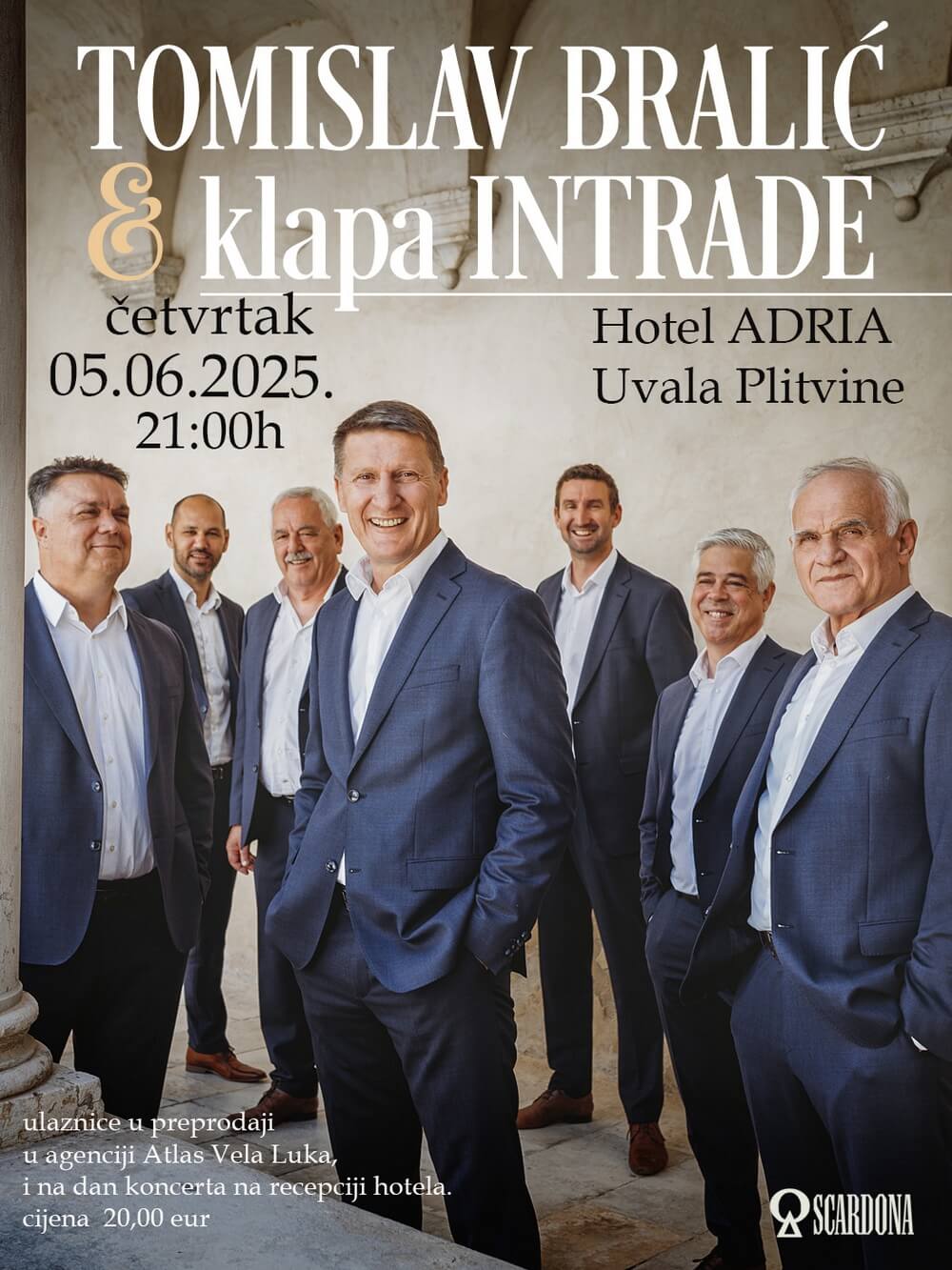 Ljubitelji dalmatinske pjesme i klapske emocije doći će na svoje u četvrtak, 5. lipnja 2025. godine, kada će Tomislav Bralić i Klapa Intrade održati koncert u predivnom ambijentu hotela Adria, smještenog u mirnoj uvali Plitvine u Veloj Luci. Početak koncerta zakazan je za 21 sat.